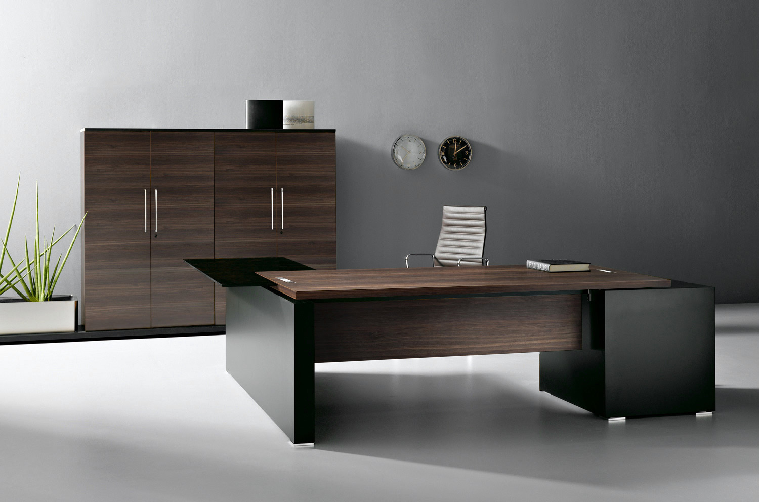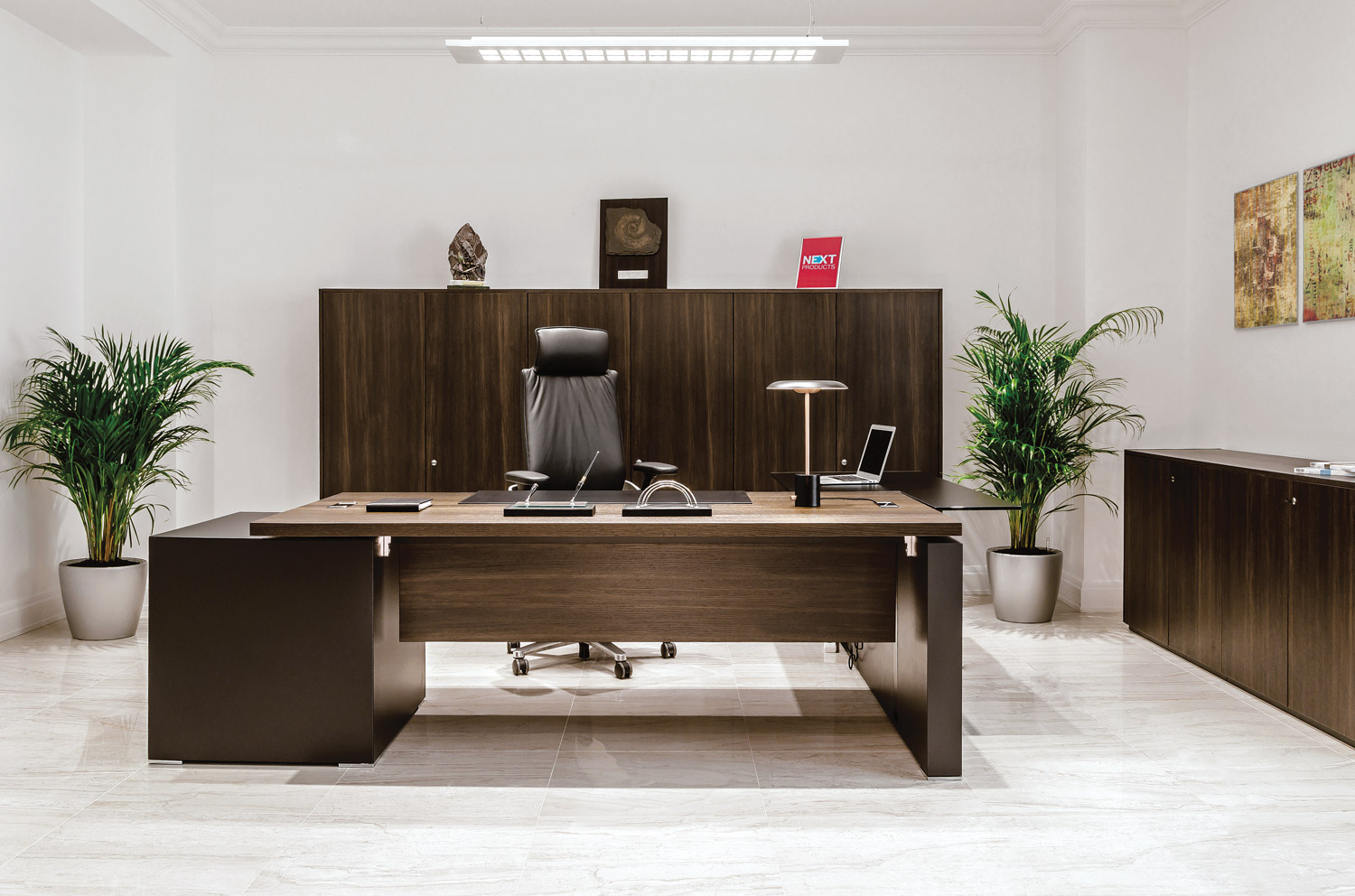 Максимум эргономичности и минимум проводов, воплощенные в роскошных оттенках жженого дуба — так можно кратко описать столы Ego Cotto. Но это далеко не все их преимущества. В наличии на выбор два варианта исполнения: с приставкой справа или с приставкой слева и опорной тумбой справа. Черные массивные опоры со встроенными коробами для электрификации идеально сочетаются с черным стеклом приставки и натуральным шпоном жженого дуба письменного стола со встроенными хромированными заглушками. Все столы снабжены передней панелью из шпонированной ДСП толщиной 19 мм. Опорная тумба из черных лакированных панелей МДФ, соединенных под углом 45° для идеального внешнего вида. Выдвижные ящики снабжены центральным замком, механизмом плавного бесшумного закрывания и широкими хромированными ручками. Для большего удобства и защиты поверхности можно дополнить стол черным кожаным бюваром.