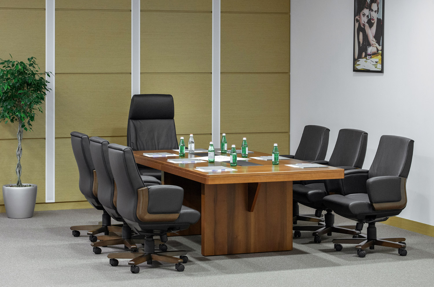В составе модели есть переговорный стол размером 230 см с вставкой из кожи