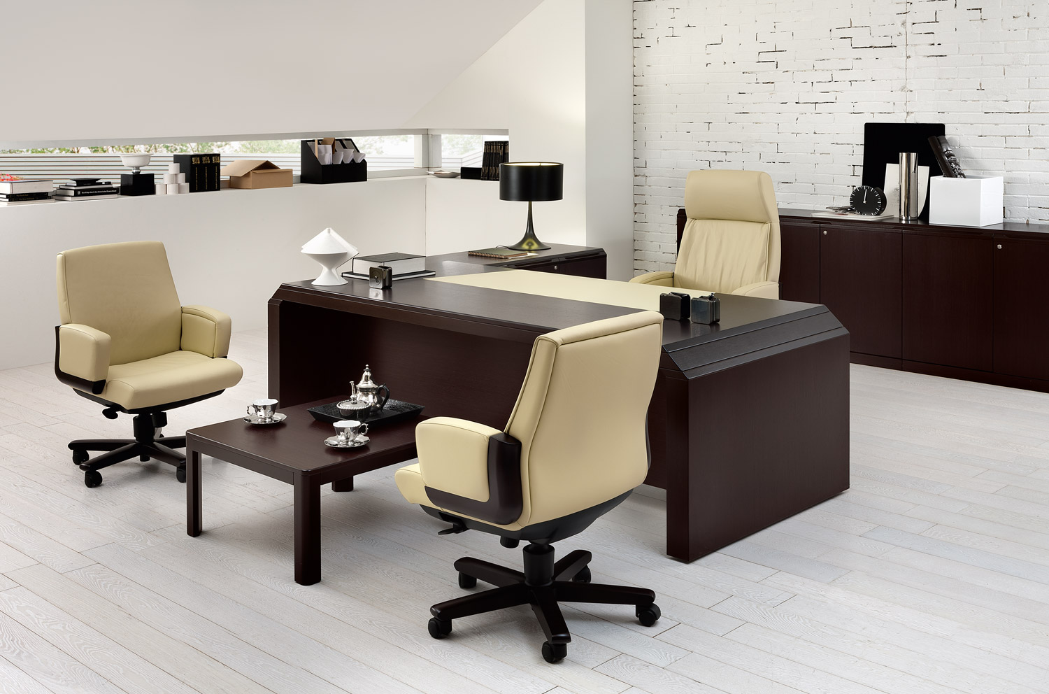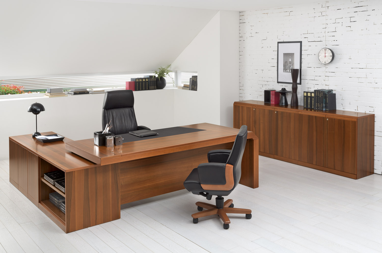 Кабинет Quaranta (натуральный шпон). У стола скошены боковые опоры. В столешнице встроенная вставка из кожи.
