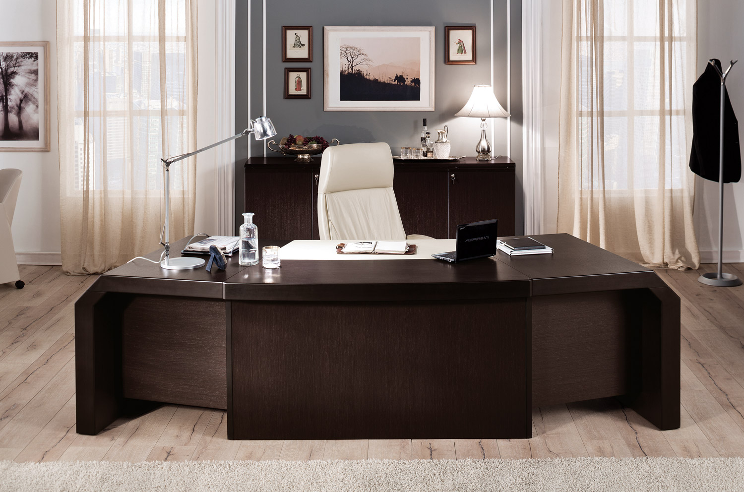 Кабинет имеет массивную столешницу и красивые боковые опоры. В столешницу встроены кожаный бювар и выдвижной ящик для канцтоваров.