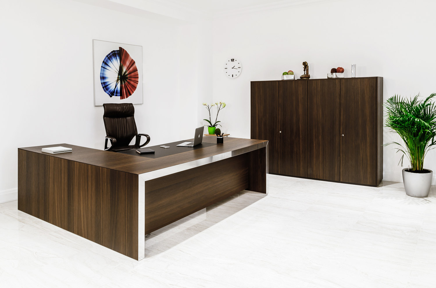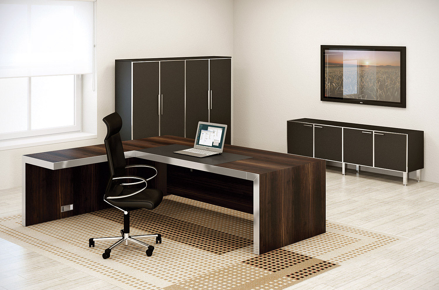 Гармоничное сочетание широкой кромки полированного алюминия толщиной 70 мм и натурального шпона жженого дуба призвано каждый раз производить неизгладимое впечатление как на посетителей кабинета, так и на его владельца. Благородное дерево шпонированных со всех сторон панелей и холодный металл алюминиевого каркаса создают лаконичный дизайн и настраивают на успешную работу. Вставка-бювар из черной экокожи обеспечивает дополнительное удобство, а встроенные кабель-каналы, скрытые в опорах, избавляют интерьер от лишних деталей. Под рабочими поверхностями нет никаких скрытых профилей или траверс, которые могли бы стать помехой для сидящего.