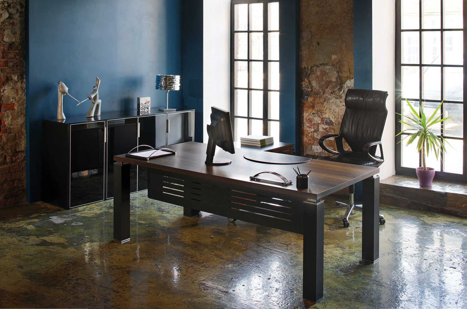 Кабинет Tao metal. Опоры — крашенный алюминий цвета «Мокко». Столешница с текстурой натурального дерева.