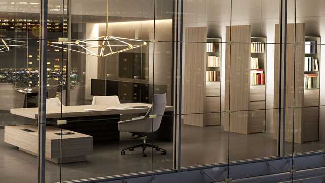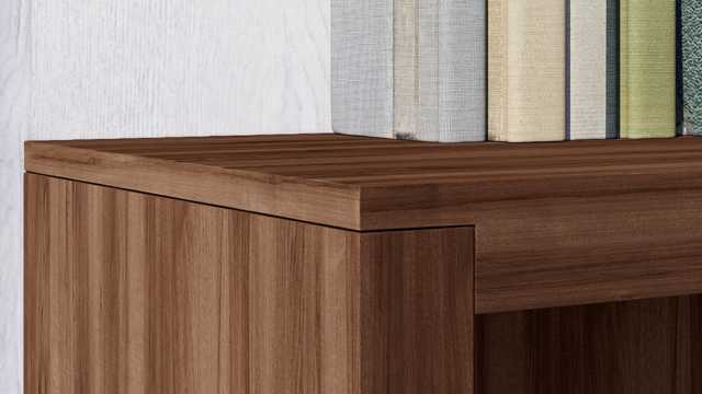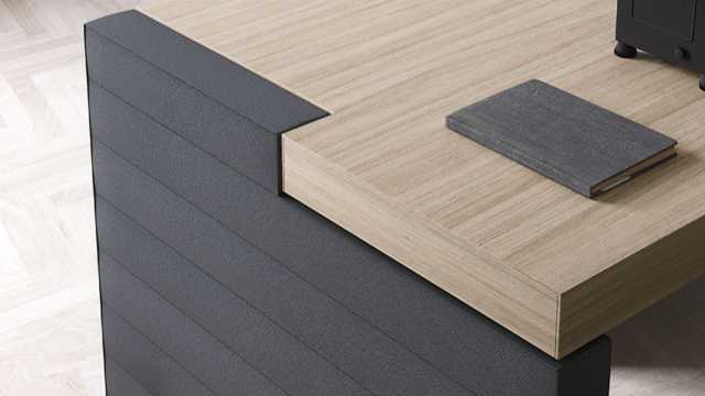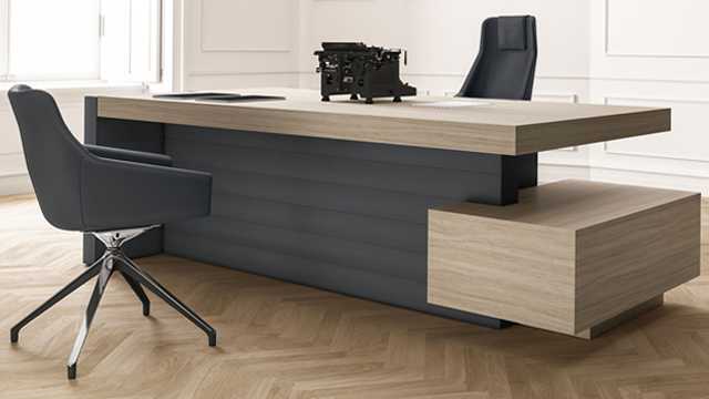Монолитность и массивность конструкции создают впечатление солидности. Боковые и задние панели обиты эко-кожей, украшены линейной прострочкой. Такое дизайнерское решение обусловлено тем, что сочетание дерева и кожи естественны в природе. Столы для руководителя Jera доступны в двух вариантах, с брифинг приставкой и без нее.