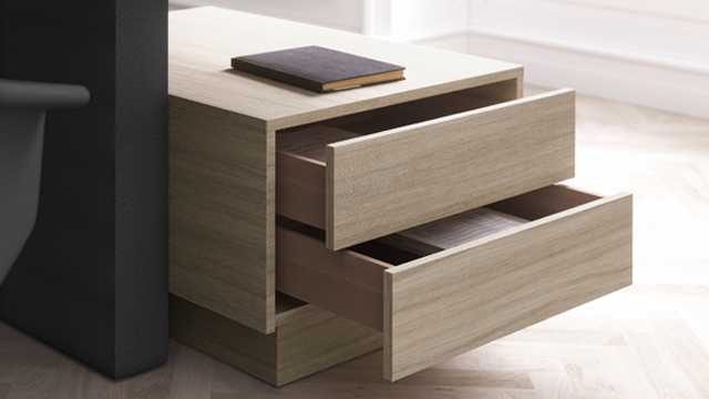 Тумба выполнена в едином стиле со столом и является его продолжением. Рабочий стол и тумба представляют собой единое целое, тем самым выглядят очень гармонично. Двери и ящики оснащены механизмом «push pull».